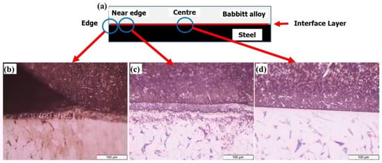 Cross section interfacial structure of Babbitt–steel composite with Sn interlayer, (a) Schematic drawing for Babbitt–steel composite with interlayer, (b) microstructure of interfacial bimetal at the edge, (c) microstructure of interfacial bimetal near edge, (d) microstructure of interfacial bimetal at the center.