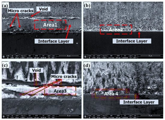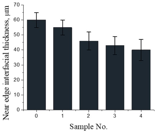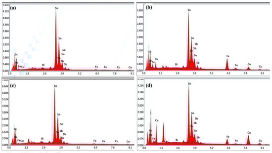 Figure 5 shows the Babbitt–steel composite’s near-edge interfacial microstructure, which includes Sn and Sn–(1–4%) Bi interlayers. Clear interlayers are observed in all Babbitt–steel composites at the interfacial near the edge. Figure 6 shows the layer thickness of a Babbitt–steel composite containing Sn and Sn–(1–4%) Bi interlayers near-edge interfacial. As shown in Figure 5 and Figure 6, adding Bi to the Sn interlayer can change the interlayer’s thickness. The Babbitt–steel composite’s interlayer thickness decreases as the proportion of Bi to Sn interlayer increases. Up until the lowest melting points of eutectic temperature (139 °C), the melting points of Sn–Bi alloys decrease. For a Bi content of 0 to 57 wt%, the Sn–Bi alloys have melting points ranging from 139 to 232 degrees Celsius [].