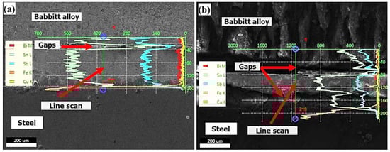 Babbitt–steel interfacial areas near edges of Sn–2% Bi interlayer and Sn–4% Bi interlayer alloys are depicted in an EDS line scan in Figure 10. Sn–Bi alloys’ Bi content, which ranges from 2% to 4%, clearly increases the interface gaps between Babbitt and steel. According to the binary phase diagram [], it is believed that increasing the Bi content of a hypo-eutectic Sn–Bi alloy lowers its melting point. The interlayer thickness between Babbitt and steel will decrease as a result of the lower melting point of the Sn-Bi alloy’s interlayer area near the edge, as shown in Figure 6. A re-melting of the higher portion of the Sn–Bi interlayer combined with Babbitt molten metal is anticipated for a higher Bi content in Sn–Bi interlayer alloy. With increasing amounts of the re-melted Sn–Bi alloy, the micro-shrinkage and voids increase due to the re-melting, mixing, and solidification processes.