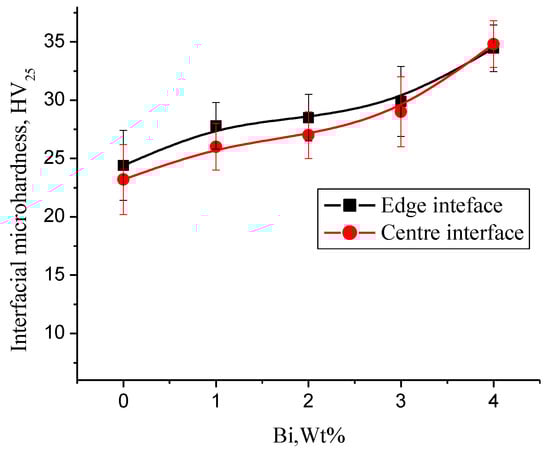 A quantitative measurement for the effect of Bi additions to Sn interlayer on the interfacial hardness of the Babbitt–steel bimetal composite is shown in Figure 11. In general, the addition of Bi to the Sn-interlayer of the Babbitt–steel composite improves the interfacial hardness. In addition, it can be observed that increasing the Bi content increases the interfacial bimetal hardness. The higher the Bi content, the harder the interfacial bimetal is. The increase in hardness brought about by the rise for Bi could be attributed to an increase in the brittle Bi precipitate present in the Sn matrix, which has limited solubility in Sn.
