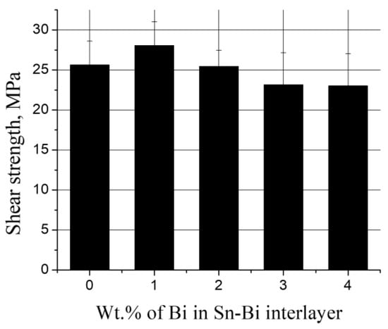 The average shear strength of Babbitt–steel bimetal composites values of Sn and Sn–Bi interlayers containing four different Bi content of bimetallic composite interfaces are shown in Figure 12. The addition of Bi to Sn interlayer increased the shear strength of Babbitt–steel bimetal composites up to 28.27 MPa with 1 wt.% alloying showing a rise of 10.3% in comparison to reference pure Sn interlayer. However, a further rise in Bi addition up to 4.0 wt% decrease in shear strength was observed. Using Sn–1% Bi interlayer alloy shows a relatively better interfacial microstructure beside of a free of micro-cracks or voids. Moreover, the decreased content of brittle Bi (1%) increases the interlayer shear strength.