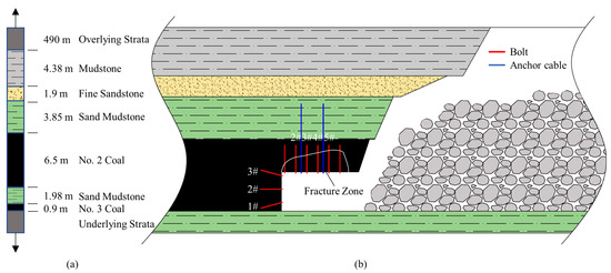 At present, the mine is mining the No. 2 coal seam, with a thickness of 3.09–8.50 m at an average of 6.20 m. The coal seam generally contains 1–2 layers of dirt band. The roof of the coal seam is sand mudstone, above is fine sandstone, the floor is sand mudstone, the comprehensive column is shown in Figure 2a, and the local floor contains fine sandstone and quartz sandstone.