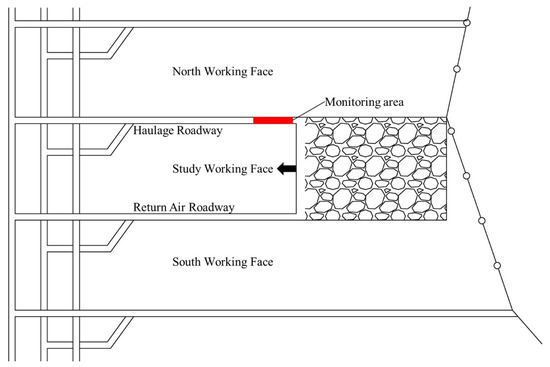 The plan of the working face is shown in Figure 3. The study working face is located in the northern area of its panel. It is arranged in two lanes, which are composed of a haulage roadway, return air roadway, cut hole, and related roundabout and chamber. The average buried depth of the working face is 500 m, the length is 299.6 m, and the advancing length is 3316 m. The working face adopts fully-mechanized top coal caving mining technology. The mining height is 3.1 m, the average height of coal caving is 3.23 m, the mining ratio is 1:1.04, and the cycle progress is 0.85 m. Both sides of the working face are not mined.