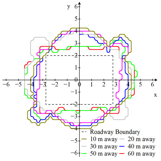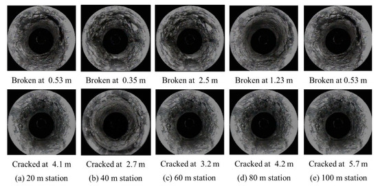 From Figure 5, it can be found that, when the distance from the working face is about 20 m, the shallow roof of the roadway is broken at 0.53 m, slight cracks appear at 4.1 m, and the deep rock layer of the roof is relatively complete. When the distance from the working face is 40 m, the roadway roof is broken near 0.35 m and cracks appear at 2.7 m of the roadway roof. From the 40 m station, the deep rock strata of the roadway roof are complete, and there is no obvious fragmentation. With the increase of the distance from the working face, the integrity of the roadway roof is better, and no obvious broken zone and cracks are found in the roof. The shallow-layer damage at 40 m and 100 m away may be caused by the influence of mining on the primary fissure of rock mass. The mine pressure of the roadway is not obvious, and the surrounding rock is in a stable state.