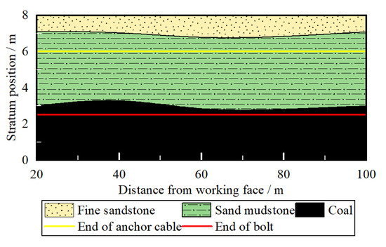 The maximum failure depth of the roadway roof strata in front of the mining face is 2.1 m. At this time, the broken area at the top of the roadway has not exceeded the anchoring range of the bolt. The roadway roof can still remain stable under the hanging of the bolt and anchor cable.