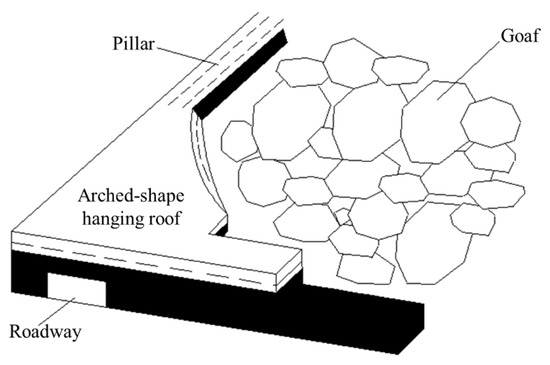 In coal mining, with the working face forward, the periodic fracture of the roof will form an arc-shaped hanging roof at the end of the working face [1,2]. The existence of a certain range of arc triangular plate structure is conducive to the stability of the roadway end and ensures the safety of the mining face. However, when the hanging roof area is too large, there will be potential safety hazards such as gas accumulation and large-scale roof collapse. The arched-shape hanging roof easily causes high underground stress and the accumulation of gas and dust [3,4]. When the hanging roof structure rotates and breaks, a large area of pressure will be generated, leading to rock burst, coal and gas outburst, or large deformations in roadways. On the other hand, in the process of moving, the end support will inevitably rub and collide with the end of the bolt at the top of the roadway, which may produce sparks and lead to the explosion of gas accumulated at the end, causing unpredictable disasters [5,6,7,8,9,10,11].