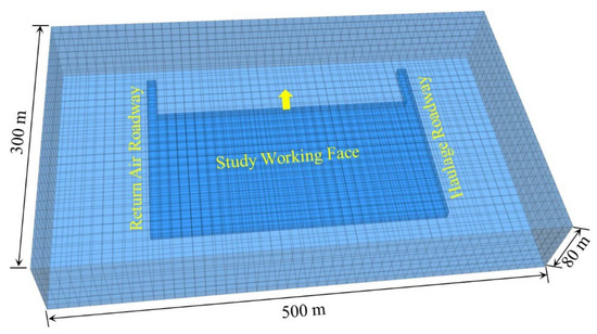 In order to analyze the influence of working-face excavation on the surrounding rock of a haulage roadway, especially the stress distribution of the surrounding rock of the haulage roadway and the characteristics of the plastic zone in front of and behind the working face under the action of mining stress, a FLAC3D numerical calculation model with a size of 500 m × 300 m × 80 m (length × width × height) is established according to the specific engineering geological conditions of the working face, and it is shown in Figure 9. We then apply displacement boundary conditions to the side and bottom of the model, and apply a vertical stress of 3 Mpa to the upper surface of the model.