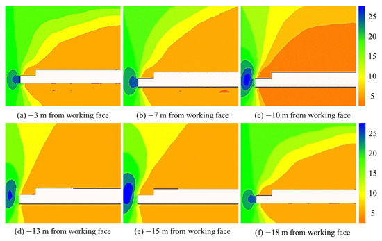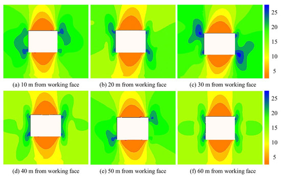 (1) Stress concentration occurs at the sharp corner of the roadway. As the distance from the working face decreases, the stress concentration phenomenon intensifies. The peak value of the stress concentration factor is 2.02, which is located near 10 m from the working face.