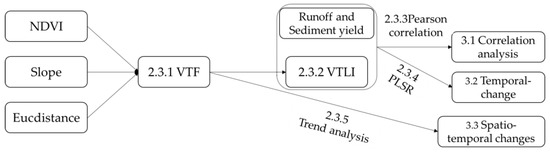 The distribution of landscape pattern can affect the production and transport of runoff and sediment [7]. NDVI, topography and distance from river system are important factors of the underlying surface [19,20,23]. Based on the vegetation coverage data and combined with the topographic characteristics of each pixel, VTF were constructed, including NDVI, slope and Eucdistance. The VTF is divided into 5 grades. VTLI was obtained by applying Fragstats4.2 to each VTF level. The correlation of each factor with sediment and runoff. The temporal of VTLI was obtained using the PLSR method. Finally, the spatio-temporal change trend of the VTF levels was analyzed. The specific process is shown in (Figure 2).