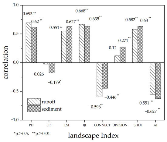 PD, IJI, LSI and SHDI are positively correlated with runoff and sediment in NURS. PD is the density of landscape patches and LSI is the complexity of landscape shape. The higher the PD and LSI values, the higher the degree of landscape fragmentation and the increase in sediment yield. In watershed management, the number of landscape patches should be reduced, and small patches should be combined to reduce the complexity of patches. IJI is the overall distribution and juxtaposition of various patches at the landscape level. The increase in IJI value leads to a greater dispersion of patches, more irregular spatial distribution and greater Mosaic degree between patches, more landscape fragmentation and more human disturbance, thus a higher runoff and sediment yield.