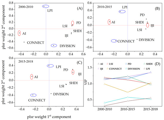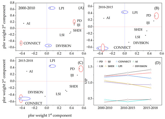 LPI and DIVISION dominate the second principal component. LPI weights dominate in positive values, while DIVISION dominate in negative values. However, in 2010–2015 and 2015–2018, the negative value of the second principal component changed to CONNECT.The importance of projection variables (VIP) varied along with time (Figure 5D). PD and IJI increased gradually, while SHDI decreased. CONNECT and LSI fluctuated, while LPI and DIVISION remained at a low level.