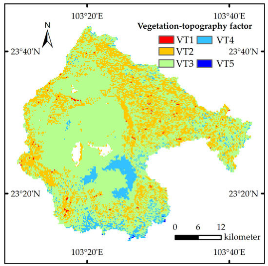 However, the landscape pattern index generated by land use patterns is generally characterized by a low temporal resolution and failure to show features such as hydrological connectivity, vegetation cover and topography. Hydrological connectivity is an important method to study the runoff (sediment) yield difficulty in watershed, which can indicate the runoff and sediment transport path and surface landscape changes [18]. Usually, the Euclidean distance between grid points and water system is used to represent the hydrological connectivity [19]. The existence of vegetation has a positive effect on reducing soil erosion [20,21], and the NDVI representing vegetation cover can be accurate to the monthly scale and beyond. The slope factor is important to sediment production and discharge process in the basin, which can increase the gravitational potential energy of the water and soil. To a certain extent, soil erosion is positively correlated with the slope, and the greater the slope, the more serious the soil erosion [22,23]. In addition, land use cannot quantify the level of soil erosion capacity. Therefore, the vegetation topographic factor (VTF) and vegetation topographic landscape index (VTLI) were constructed in this paper. VTF is composed of vegetation cover, terrain slope and Euclidean distance to the water system, which can reflect the water and soil conservation capacity in the watershed. Based on the classification of the VTF, the landscape pattern index was further calculated. Through the relationship between each VTF grid, the influence of each VTF on the sediment production in the basin and the change in the importance degree of a certain factor influencing sediment production were studied.