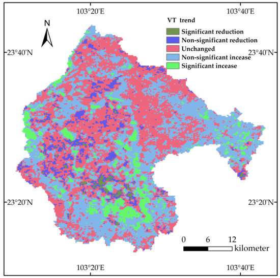 In the above formula, VTFi is the average value of VTF in year i, S is the slope of the pixel regression equation, and n is the time length. When S > 0, the VTF of the pixel is increasing. When S = 0, it indicates that the VTF of the pixel is basically unchanged. When S < 0, the VTF of the pixel is decreasing.