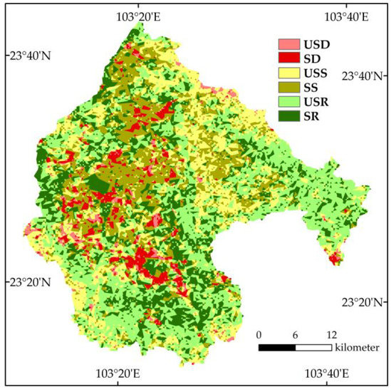 Since 2008, Yunnan province has implemented a series of key ecological projects, including a shelterbelt project in the upper reaches of the Pearl River, a comprehensive agricultural development project in mountainous areas, and a terraced field project to return farmland to forest or grassland [42]. With the State Council approving the Rocky Desertification in the Karst Region Comprehensive Treatment Planning Outline (2006–2015), the local government launched the rocky desertification comprehensive treatment pilot work. The steep slope zone of the NURS was restored with natural afforestation, artificial afforestation and farmland with more than 25° slope abandonment to control soil erosion.