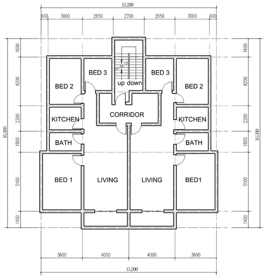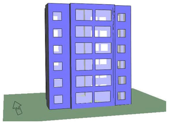 The Apache Sim anisotropic solar radiation model is selected, and the temperature of the building is determined before the simulation. There are 10 preprocessing days, direct shading and internal sun tracking are calculated using Sun Cast, the number of time steps is set to 10 min, and the average output time interval of the results is 60 min [2]. A typical multi-story residential building is used as a geometric model to analyze and calculate the heat gain of the envelope. A standard floor plan of such a building is shown in Figure 5. The total height of the building is 18.8 m, and the shape coefficient is 0.28. The long-wave radiation rate of the roof is 0.9, and the solar radiation absorption coefficient is 0.7. The long-wave radiation rate of the exterior wall is 0.9, and the solar radiation absorption coefficient is 0.5. The geometric model used for calculation is shown in Figure 6.