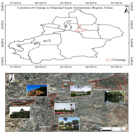 Located in the center of Asia and Europe (86°37′33″–88°58′24″ E, 42°45′32″–45°00′00 N), Urumqi is a typical oasis city in the arid zone. The greening coverage of Urumqi has long been at a low level compared with other Chinese cities. However, it has improved year by year in recent years, and the urban greening rate reached 40.9% in 2016, exceeding the national average (40.3%) for the first time [44]. As of 2018, the total built-up area of Urumqi was 436 km2, with a resident population of 3,505,800, an urban population of 2,165,700, and an urbanization rate of 74.61% [44]. The total green area in the central city is 149 km2, the park green area accounts for 32.36 km2, the per capita park green area is about 12 m2, and the gross product is 309.977 billion yuan [45]. The ecological construction goal of “creating a national ecological garden city” was proposed in 2018 [46]. During the period of January–November 2021, the total number of visitors to the parks in Urumqi was 80,585,800, an increase of 40.83% year-on-year, and tourism revenue was 61.305 billion yuan, an increase of 34.21% year-on-year (http://www.urumqi.gov.cn/, accessed on 20 October 2022). This implies that people’s demand for outdoor recreation is gradually increasing, and meeting people’s outdoor recreation demand relies mainly on public parks [47]. This study tested the effect of certain specific factors on park visitation, thus minimizing variability beyond the experimental control variables by conducting the survey in a setting that is similar in many respects. Due to the limitation of the small number of parks in Urumqi, we selected the study area in areas with relatively concentrated population and complete public facilities based on the Urumqi City General Urban Plan (2014–2020) and the attributes of each park. This was used to represent the general situation of the overall parks in Urumqi. According to the national Standard for Classification of Urban Green Spaces (CJJ/T85-2002) and Table 1, the study subjects were divided into urban parks (Hongshan Park, People’s Park, Nanhu Square, South Park) and country parks (Yamarik Hill Park, Shuimagou Park). The specific characteristics of the park are shown in Table 2 and Figure 1.