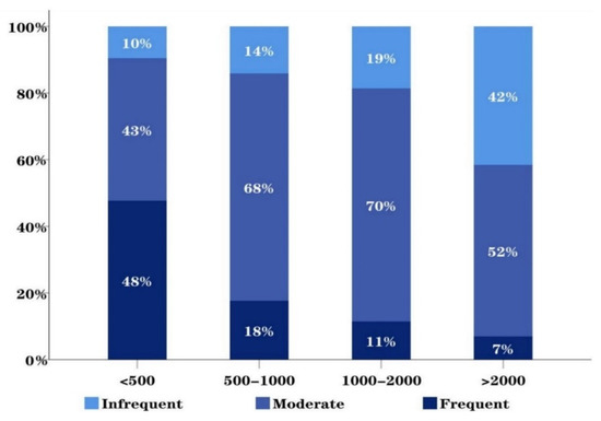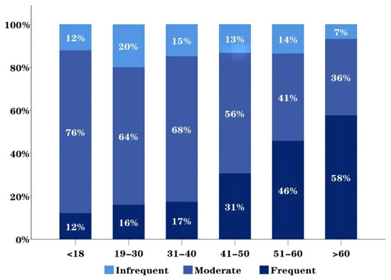 Despite social and cultural differences, the influencing factors that affected residents’ visits to parks were similar to those in other countries. Among the socio-demographic factors, age was positively correlated with frequency of use, while income and education level were negatively correlated with frequency of use. To facilitate the analysis, we classified the frequency of park use by visitors into infrequent, moderate, and frequent. Among them, daily park use 3–5 times per week were classified as frequent, 1–2 times per week and 1–3 times per month were classified as moderate, and 1–3 times per year were classified as infrequent (Figure 2). As seen in Figure 2, the largest percentage of respondents who used the park moderately were minors younger than 18 years old (76%), and the smallest percentage of users were over 50 years old (35%–41%). Among infrequent park users, the largest proportion of users was between the ages of 19–30 (20%), and only 7% were older than 60 years old. Among frequent park users, the most frequent users were in the 51–60 and over 60 age groups (46% and 48%). This indicates that the most frequent park users are older people, and the infrequent park users are younger people. This may be because older people have less stressful jobs and usually have more leisure time. However, as can be seen from Table 7, leisure time has no significant effect on visit frequency. Maas et al. reported that loneliness and perceived lack of social support were mediating factors in the relationship between green parks and physical and mental health for older residents [53]. Parks are an important place for older adults to make friends, and 80% of respondents who meet their friends in parks are over 60 years old; they are also considered to be the group that benefits the most from parks [54]. This was also confirmed in this study using the motivation survey. The social interaction and restorative landscape features in green parks have an irreplaceable role in the daily lives of older people [55]. China’s population is currently aging, and the elderly are the main group of people using parks. For this reason, planners must consider the needs of elderly people using parks.