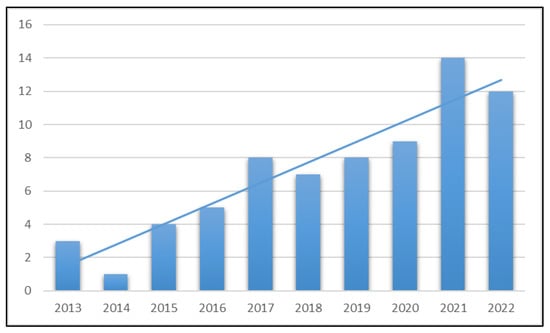To ascertain the importance and influence of an article in its field, there are many methods; however, the simplest and one of the most objective methods is to see the number of citations it received []. In this way, the trendsetter articles, their impact on the dynamics of the field, and the way the research stream follows can be understood. Therefore, the most frequently cited ten articles for the years 2013 through 2022 are presented in Table 1.