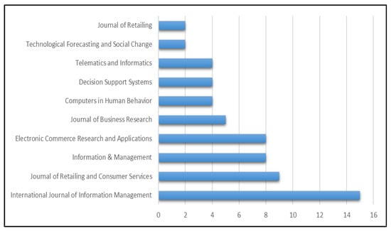 Ranking of the top 10 journals with the most articles on social commerce and purchase intention by number of articles published between 2013 and 2022.