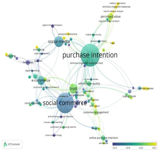 As depicted in Figure 4, a bibliometric study was performed to examine the development of the s-commerce field using the two main keywords. The bibliometric networks are visualized by the VOSviewer software, using “social commerce” and “purchase intention” as the main research keywords.