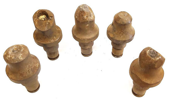 Set of de-mounted, exploited N3 conical picks, prepared for mass and volume measurements.
