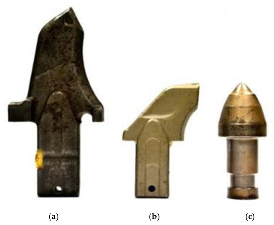 Mining cutting picks: (a) tangent, (b) radial, and (c) conical.