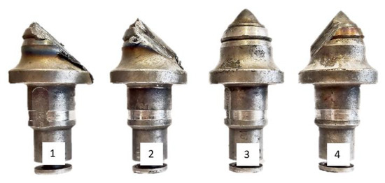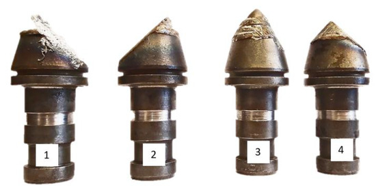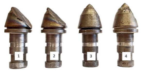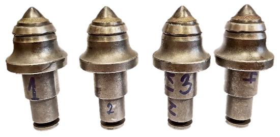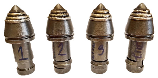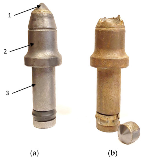 Conical pick: (a). brand new: 1—WC-Co insert, 2—working part, 3—handle part, and (b). worn out example with fallen off WC-Co insert.