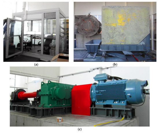 Laboratory test stand for testing by cutting or rotary drilling with single cutting tools or heads: (a) operator’s cab, (b) concrete sample with linear displacement system, and (c) cutting head (test disc) drive.