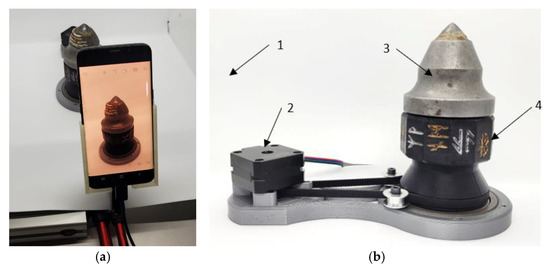 A view of the scanning setup: (a) alignment of the camera with respect to the scanned object and photography tent, and (b) detailed view of the setup: 1—tent’s background, 2—digitally controlled turntable, 3—scanned tool, 4—additional markers.