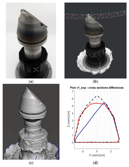 Schematic of consecutive steps of conical pick geometry capture: (a) exemplary 2D image of the scanned tool, (b) reconstructed 3D model with texture (white rectangles correspond with camera position), (c) stereolitographic model with minor filtering applied, and (d) view of maximal (red) and minimal (blue) cross-sectional projection compared to the uniform cross-section of the template tool (dashed line).