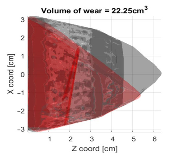 Exemplary result fromf measurement of the volumetric loss of N1 pick (position 1). The grey outline refers to the brand-new tool scan, the red one shows the minimal cross-section of the particular tool.