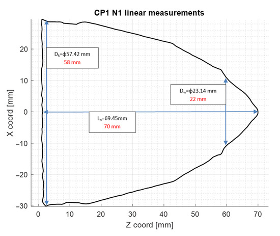 Averaged cross-sectional dimensions of the scanned N1 (position 1) pick. The black dimensions refer to the virtual measurement of the scan, and the red dimensions refer to the manually measured values.