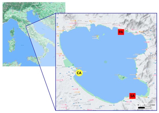 Lake Trasimeno: study area and sampling sites (CA, Castiglione del Lago; PA, Passignano sul Trasimeno; SA, S. Arcangelo).