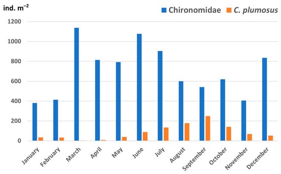 Surprisingly, the share of the highest average monthly density (85.95 ind. m−2) among the chironomid populations in the littoral area of Lake Trasimeno is not up to C. plumosus, instead it is up to Polypedilum sp., which has a much higher average density (191.65 ind. m−2). In addition, Cladotanytarsus sp. shows a monthly average density (93.07 ind. m−2) greater than C. plumosus. However, these chironomid taxa are common, and sometimes dominant, in the littoral areas of lakes, and their observed densities are comparable to those from other shallow lakes [].