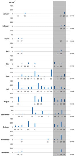 Monthly mean larval density of Chironomus plumosus (2005–2021) in the Lake Trasimeno littoral zone. Only the years subject to monitoring are indicated (example: 05 corresponds to 2005); the intensification of the field survey in the years 2017–2020 is indicated in grey.