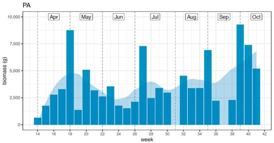 To validate these results, adult chironomid collections made continuously by ChiroTraps from April to October of the years 2018–2020 were also examined. It was discovered that light attraction affected chironomids almost exclusively. In the PA ChiroTrap, the biomass of fauna other than chironomid taxa amounted only to 0.35%, while in the SA ChiroTrap it amounted to 3.41%. It was also verified and confirmed that among the chironomids, C. plumosus predominated in the trap collections. Figure 4 shows the biomass captured on a weekly basis between 6 p.m. and 11 p.m. at PA in 2020, which had the most efficiency as site and year for data collection and was less influenced by other fauna. As shown in Figure 4, the four annual swarmings occurred during the same seasonal periods highlighted in Figure S1.