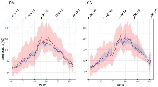 Air and water temperature weekly mean (2019) measured in the littoral zone of Lake Trasimeno with the ChiroTraps at Passignano sul Trasimeno (PA) and S. Arcangelo (SA). Red lines indicate the mean air temperature (min and max oscillation in pink), blue lines indicate the mean water temperature (min and max oscillation in grey).