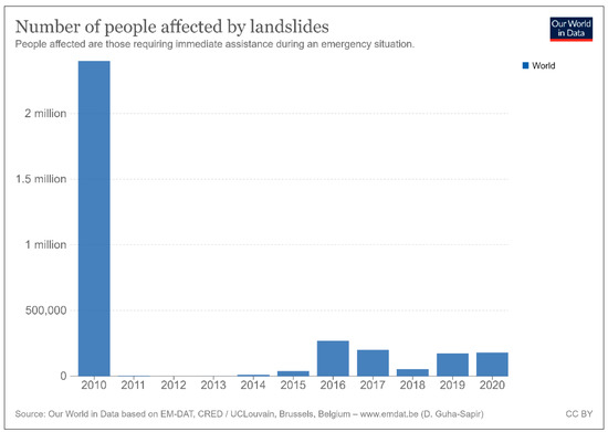 A landslide is a natural disaster involving mostly the movement of soil surfaces, rock falls, or a combination of both movements, and is commonly associated with gravitational attraction [1,2,3,4]. The number of fatalities often depends on the severity of the landslide event, concerning thousands of human lives and the economy. Although landslides have caused a lower death toll compared to other disasters, the destructive effects of the later consequences are rather devastating. Due to their adverse losses and significant damage, which always result in at least 17% of casualties and billions of dollars of financial losses worldwide, landslides are quickly acknowledged as the third most notorious phenomenon devastating many parts of the world [5,6]. For instance, the mountainous areas of Peru experienced the most catastrophic landslides in 1970, when these events killed approximately 18,000–20,000 people [7]. According to NASA, more than 8935 landslides took place around the world, with 1120 cases scattered in Southeast Asia. On top of that, in the year 2010, the highest number of people affected by landslides was recorded, 89% of which were from China (Figure 1).