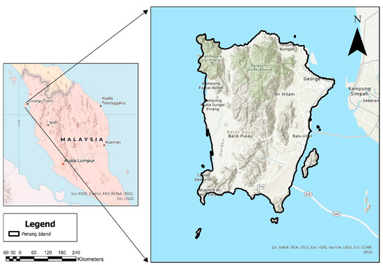 Penang Island was chosen as the study area due to its history of frequent landslide occurrences. Penang is located in Northwest Peninsular Malaysia at 5.4164° N, 100.3327° E and is 1 of the 14 states of Malaysia, see Figure 2. The terrain consists of coastal plains, hills, and mountains. Penang Island covers an area of approximately 293 km2, the fourth largest island in Malaysia, and is separated from the mainland by a channel. It has seen rapid industrialization, rapid technological progress, and the greatest rate of urbanization, resulting in increased demand for land [30]. The Institute of Strategic and International Studies and Penang Development Corporation stated that Penang Island is made up of steep topography above 60 m (exceeding 50% of the land area), which makes half of Penang’s land vulnerable to landslides. Since September 1995, Penang Island has recorded 60 landslide incidents in the Penang Hill area following a freak storm that damaged the pathway near the Penang Botanical Gardens [31]. The changes in land use in Penang Island, which developed along the hillside to accommodate the population growth, are indirectly increasing the frequency of landslide occurrences in the area. This, in the end, will cause an expansion of urbanization. Along with Kuala Lumpur, Penang Island has also experienced rapid urbanization due to industrial activities. For instance, according to the Department of Statistics Malaysia, the level of urbanization in Penang is 90.8% and is among the highest, after Kuala Lumpur, Putrajaya, and Selangor. The saturated urbanization in Penang today is associated with the drastic population increase. Additionally, [32] stated that with the increase in the human population, people have started to dig deeper pits to seek essential minerals. Hence, landslides will be intensified by abrupt and large-scale changes in land use, such as developing new land for neighborhoods, infrastructure, and cities in order to support population demands.