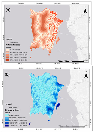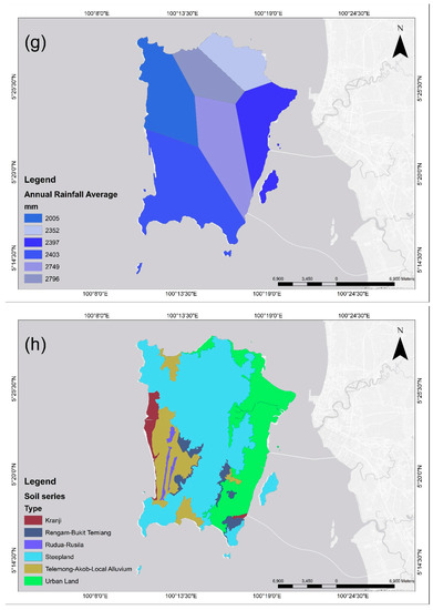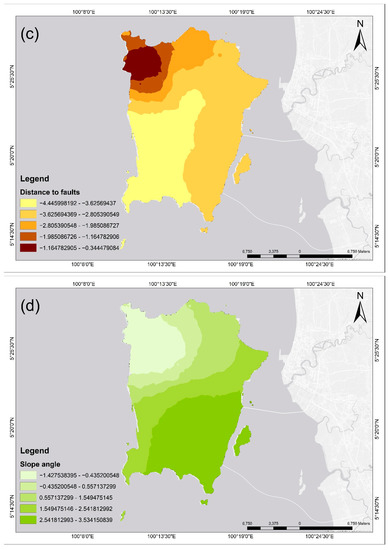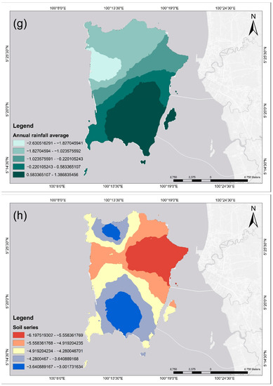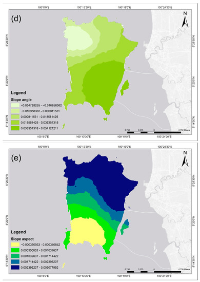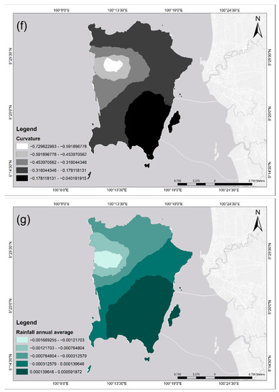 Therefore, Figure 6 demonstrates a compilation of 10 integrated maps of the landslide factors considering each t-value. Each variable is distinguished by a 5-color scheme to visualize the significance level in different areas. Figure 6a,c,e,h shows that distance to roads, distance to faults, curvature, and soil series values are negative across the study area, indicating that roads, faults, curvature, and soil series factors have a negative influence on landslide occurrences. Apart from that, negative values for distance to rivers and lithology were scattered across the study area, except for in the southwest and in the northwest, respectively (Figure 6b,i). Meanwhile, Figure 6g describes the annual rainfall average factor, showing that the t-values do not always stay positive, as negative values are found in the center and towards the northwestern part of Penang Island.