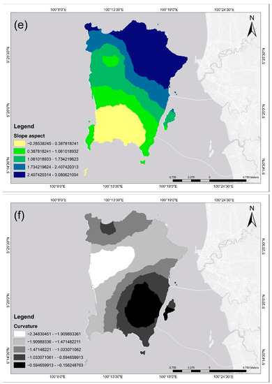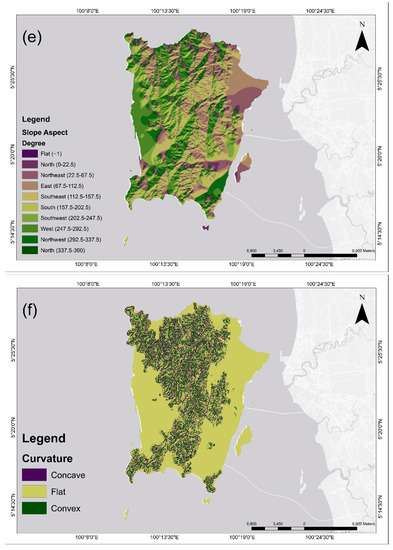 Figure 5 and Figure 6 both suggest that both the slope angle and the slope aspect are positively correlated with landslides, as the values increased, thus increasing the probability of landslide occurrences. This indirectly shows that both the slope angle and the slope aspect are the most significant factors influencing landslide occurrences in Penang Island, necessitating comprehensive mitigation actions. Because Penang Island is made up of steep topography above 60 m (exceeding 50 percent of the land area), half of Penang’s land is vulnerable to landslides. As the slope angle increases, shear stress in soil or other unconsolidated material generally increases as well [45]. Even though the slope angle is one of the factors deemed to be significant, it does not always remain a positive influence. The results show that the northwestern part conveys small negative values, indicating that the slope angle is less likely to contribute to landslide occurrences there. Meanwhile, according to [46,47,48], apart from the East-facing slopes, a slope that does not face the sun has a low temperature with a high soil moisture that when it is disturbed, it will tend to influence the landslide occurrences. Therefore, it is necessary to reinforce the slope treatment in other parts of Penang Island, instead of the northwestern part.