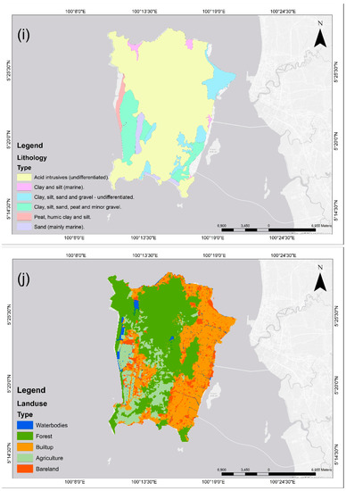 Thematic layer maps: (a) distance to roads, (b) distance to rivers, (c) distance to faults, (d) slope angle, (e) slope aspect, (f) curvature, (g) annual rainfall average, (h) soil series, (i) lithology, and (j) land use.