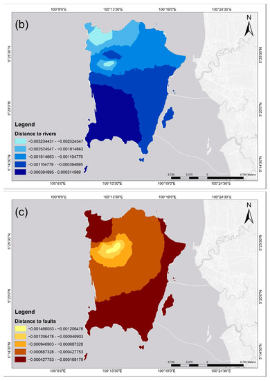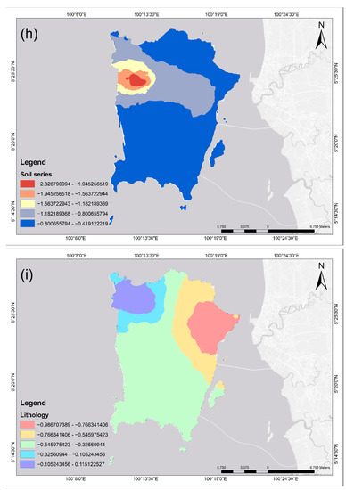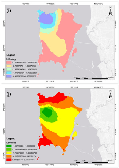 Distance to rivers values, as shown in Figure 5b, convey various values ranging from −0.0032 to 0.00031, with negative values scattered across Penang Island, except for in the southwest. Meanwhile, distance to faults values remain negative and range from −0.0014 to −0.000016, as described in Figure 5c. Figure 5d represents the variation of slope angle values; negative values were only found in the northwestern part of the study area and range from −0.034 to −0.016, whereas other parts of Penang Island show positive values ranging from 0.00081 to 0.054. Figure 5e shows that the curvature values are constantly negative and range from −0.72 to −0.040, meanwhile slope aspect values range from −0.00033 to 0.003, as described in Figure 5f; slope aspect values are only negative in the southwest. For annual rainfall average, the estimated parameter is not always positive, as values range from −0.0016 to −0.00031 and are scattered in the center of Penang Island and towards the northwest (Figure 5g). Figure 5h depicts the soil series factor, which constantly shows negative values ranging from −2.32 to −0.41. Similarly, the lithology factor in Figure 5i shows that the majority of lithology types deliver negative values ranging from −0.98 to 0.12. Lastly, Figure 5j represents the estimated parameter for land use; values range from −0.29 to 0.073 and the majority of them are negative.