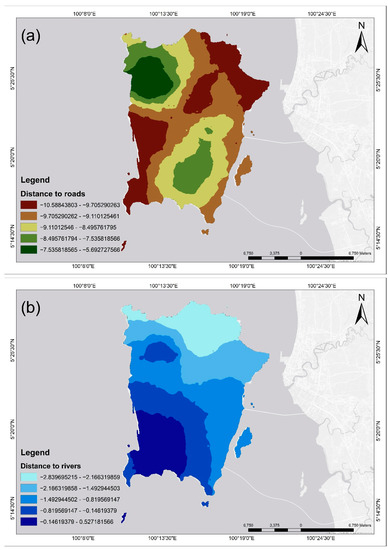 For instance, Figure 5 expresses the estimated parameter values calculated in the GWR software. Evaluated values for a particular independent variable that are negative indicate a negative impact on the dependent variable, whereas a positive sign shows a significant influence on the occurrences of the dependent variable. Figure 5a represents parameter estimate values for distance to roads, which constantly shows negative values in all parts of the study area, ranging from −0.0054 to −0.0025. This shows that distance to roads does not influence the occurrence of landslides, as road networks are concentrated on the east side of the study area where the slope’s steepness is less than 15°.