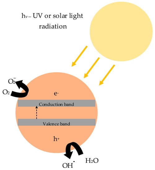 In a photocatalytic reaction, a photocatalyst (semiconductor such as titanium dioxide) is irradiated. Due to energy introduction, electrons (e−) from the semiconductor shift from the valence band (vb) to the conduction band (cb), leading to the formation of electron holes h+ (Equation (1)). The resulting pairs of charges initiate a reduction–oxidation process (Figure 1). As this reaction mainly occurs in the air environment, in the presence of adsorbed oxygen and water (strong oxidants), it is possible to decompose a wide range of air pollutants due to the formation of hydroxyl radicals (OH.) and superoxide radicals ( (Equations (2) and (3)) [].