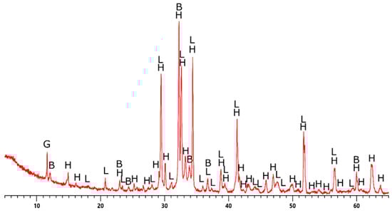 Phase analysis of CEM II A-S 52.5R cement (H—hatrurite, L—larnite, B—brownmillerite, G—gypsum).