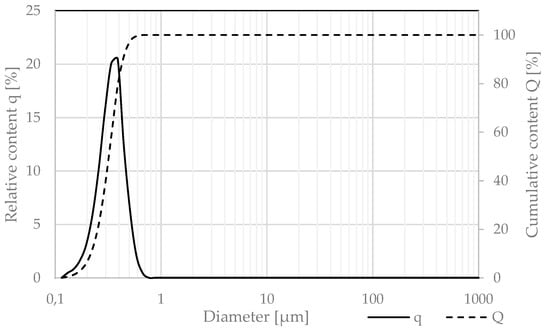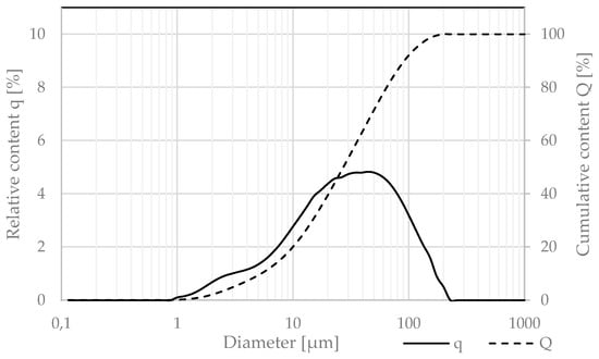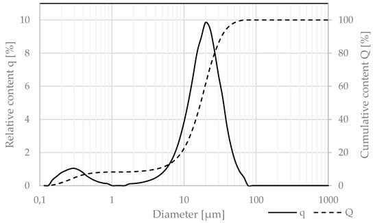 The quartz powder used in this study met the requirements of ISO/DIS 3262-13 []. Its granulation was measured via the laser diffraction technique and is presented in Figure 8, using the same test procedures as for the cement.