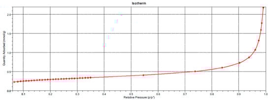 The nanoparticulate silica used in the study (Łaziska, Poland) met the requirements of EN 13263-1 []. Its specific surface area was measured via the BET method and was 23.86 m2/g, with its adsorption isotherm as shown in Figure 5.
