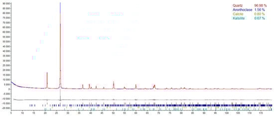 The phase composition of cement was investigated via the XRD method. Cement samples, as in the case of XRF analysis, were dried. Then, they were placed in special steel holders and properly smoothed (a prerequisite for proper XRD measurement). The sample prepared in this way was placed in the measuring magazine and then in the diffractometer. The measurement was carried out in the range of 5–65° 2θ, with a single step of 0.02° 2θ lasting 5 s (Figure 3).