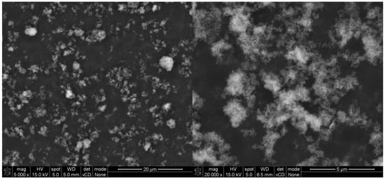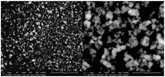 The chemical composition of titanium dioxides was investigated via the XRF method, with the same test procedure as for the cement. The results are presented in Table 7. The morphology of grains of both TiO2 (A) and (B) is shown on SEM images in Figure 9 and Figure 10.